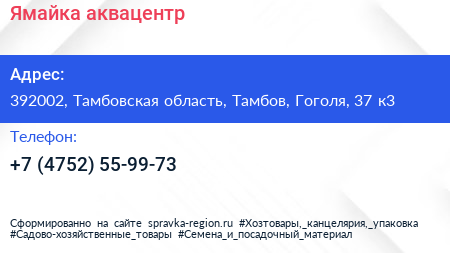 Ямайка, аквацентр по адресу 392002, Тамбовская область, Тамбов, Гоголя, 37 к3 в дальнейшем Организация, размещена в следующих категориях: