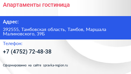 Апартаменты, гостиница по адресу 392555, Тамбовская область, Тамбов, Маршала Малиновского, 39Б в дальнейшем Организация, размещена в следующих категориях:
