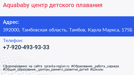 Aquababy, центр детского плавания по адресу 392000, Тамбовская область, Тамбов, Карла Маркса, 175Б в дальнейшем Организация, размещена в следующих категориях: