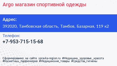 Argo, магазин спортивной одежды по адресу 392020, Тамбовская область, Тамбов, Базарная, 119 к2 в дальнейшем Организация, размещена в следующих категориях: