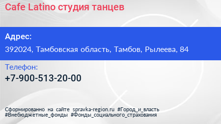 Cafe Latino, студия танцев по адресу 392024, Тамбовская область, Тамбов, Рылеева, 84 в дальнейшем Организация, размещена в следующих категориях: