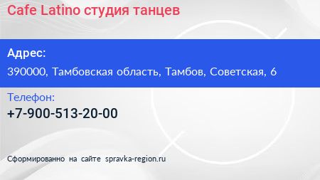 Cafe Latino, студия танцев по адресу 390000, Тамбовская область, Тамбов, Советская, 6 в дальнейшем Организация, размещена в следующих категориях:
