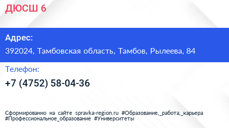 ДЮСШ №6 по адресу 392024, Тамбовская область, Тамбов, Рылеева, 84 в дальнейшем Организация, размещена в следующих категориях: