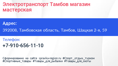 Электротранспорт Тамбов, магазин-мастерская по адресу 392008, Тамбовская область, Тамбов, Шацкая 2-я, 59 в дальнейшем Организация, размещена в следующих категориях: