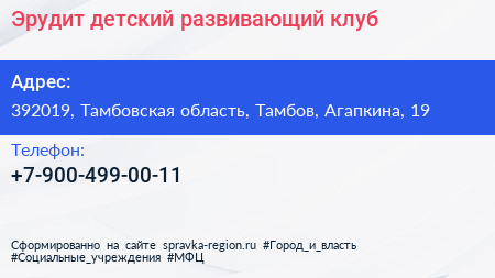 Эрудит, детский развивающий клуб по адресу 392019, Тамбовская область, Тамбов, Агапкина, 19 в дальнейшем Организация, размещена в следующих категориях: