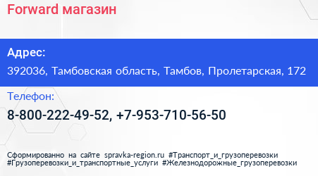 Forward, магазин по адресу 392036, Тамбовская область, Тамбов, Пролетарская, 172 в дальнейшем Организация, размещена в следующих категориях: