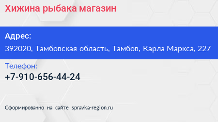 Хижина рыбака, магазин по адресу 392020, Тамбовская область, Тамбов, Карла Маркса, 227 в дальнейшем Организация, размещена в следующих категориях: