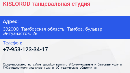 KISLOROD, танцевальная студия по адресу 392000, Тамбовская область, Тамбов, бульвар Энтузиастов, 2к в дальнейшем Организация, размещена в следующих категориях:
