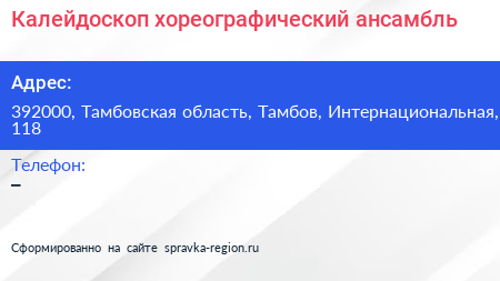 Калейдоскоп, хореографический ансамбль по адресу 392000, Тамбовская область, Тамбов, Интернациональная, 118 в дальнейшем Организация, размещена в следующих категориях: