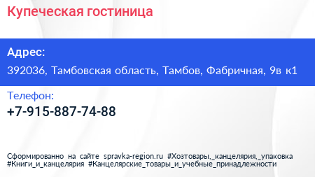 Купеческая, гостиница по адресу 392036, Тамбовская область, Тамбов, Фабричная, 9в к1 в дальнейшем Организация, размещена в следующих категориях:
