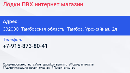 Лодки ПВХ, интернет-магазин по адресу 392030, Тамбовская область, Тамбов, Урожайная, 2л в дальнейшем Организация, размещена в следующих категориях: