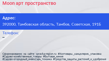 Moon, арт-пространство по адресу 392000, Тамбовская область, Тамбов, Советская, 191Б в дальнейшем Организация, размещена в следующих категориях: