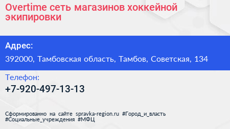 Overtime, сеть магазинов хоккейной экипировки по адресу 392000, Тамбовская область, Тамбов, Советская, 134 в дальнейшем Организация, размещена в следующих категориях:
