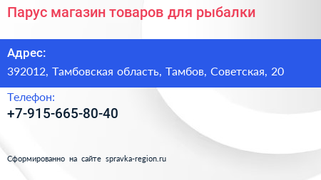 Парус, магазин товаров для рыбалки по адресу 392012, Тамбовская область, Тамбов, Советская, 20 в дальнейшем Организация, размещена в следующих категориях: