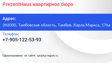 PrezentHaus, квартирное бюро по адресу 392000, Тамбовская область, Тамбов, Карла Маркса, 176а в дальнейшем Организация, размещена в следующих категориях: