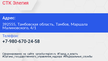 СТК Элегия по адресу 392555, Тамбовская область, Тамбов, Маршала Малиновского, 4/1 в дальнейшем Организация, размещена в следующих категориях: