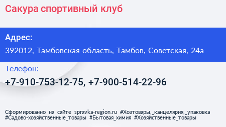 Сакура, спортивный клуб по адресу 392012, Тамбовская область, Тамбов, Советская, 24а в дальнейшем Организация, размещена в следующих категориях: