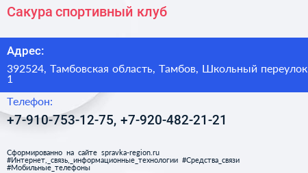 Сакура, спортивный клуб по адресу 392524, Тамбовская область, Тамбов, Школьный переулок, 1 в дальнейшем Организация, размещена в следующих категориях: