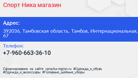 Спорт-Ника, магазин по адресу 392036, Тамбовская область, Тамбов, Интернациональная, 67 в дальнейшем Организация, размещена в следующих категориях: