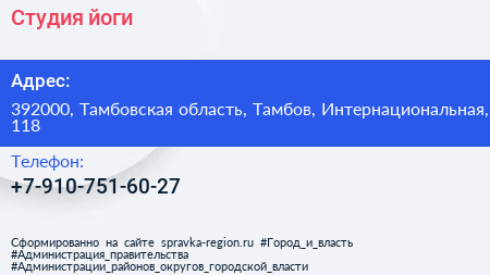 Студия йоги по адресу 392000, Тамбовская область, Тамбов, Интернациональная, 118 в дальнейшем Организация, размещена в следующих категориях: