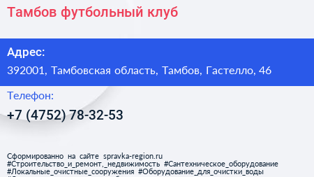 Тамбов, футбольный клуб по адресу 392001, Тамбовская область, Тамбов, Гастелло, 46 в дальнейшем Организация, размещена в следующих категориях:
