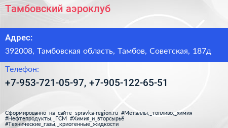 Тамбовский аэроклуб по адресу 392008, Тамбовская область, Тамбов, Советская, 187д в дальнейшем Организация, размещена в следующих категориях: