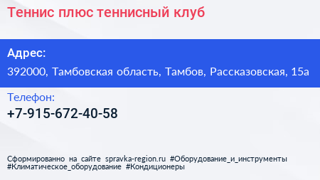 Теннис плюс, теннисный клуб по адресу 392000, Тамбовская область, Тамбов, Рассказовская, 15а в дальнейшем Организация, размещена в следующих категориях: