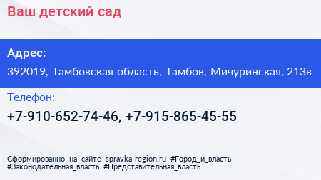 Ваш детский сад по адресу 392019, Тамбовская область, Тамбов, Мичуринская, 213в в дальнейшем Организация, размещена в следующих категориях: