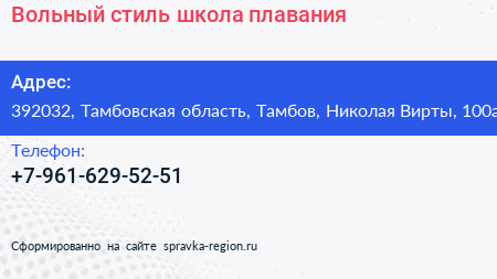 Вольный стиль, школа плавания по адресу 392032, Тамбовская область, Тамбов, Николая Вирты, 100а в дальнейшем Организация, размещена в следующих категориях: