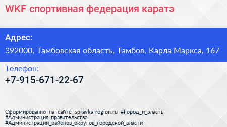 WKF, спортивная федерация каратэ по адресу 392000, Тамбовская область, Тамбов, Карла Маркса, 167 в дальнейшем Организация, размещена в следующих категориях: