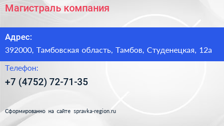 Магистраль, компания по адресу 392000, Тамбовская область, Тамбов, Студенецкая, 12а в дальнейшем Организация, размещена в следующих категориях: