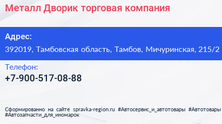 Металл Дворик, торговая компания по адресу 392019, Тамбовская область, Тамбов, Мичуринская, 215/2 в дальнейшем Организация, размещена в следующих категориях: