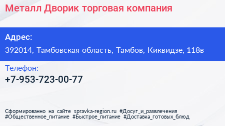 Металл Дворик, торговая компания по адресу 392014, Тамбовская область, Тамбов, Киквидзе, 118в в дальнейшем Организация, размещена в следующих категориях: