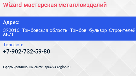 Wizard, мастерская металлоизделий по адресу 392016, Тамбовская область, Тамбов, бульвар Строителей, 6Б/1 в дальнейшем Организация, размещена в следующих категориях: