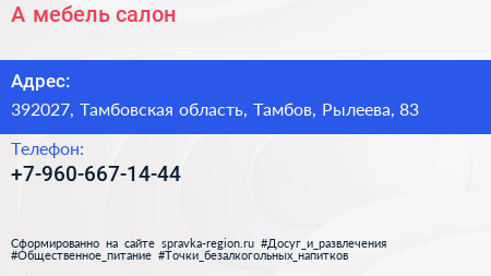 А-мебель, салон по адресу 392027, Тамбовская область, Тамбов, Рылеева, 83 в дальнейшем Организация, размещена в следующих категориях: