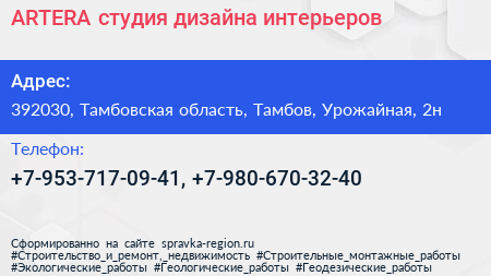 ARTERA, студия дизайна интерьеров по адресу 392030, Тамбовская область, Тамбов, Урожайная, 2н в дальнейшем Организация, размещена в следующих категориях: