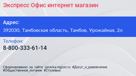 Экспресс-Офис, интернет-магазин по адресу 392030, Тамбовская область, Тамбов, Урожайная, 2л в дальнейшем Организация, размещена в следующих категориях: