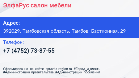 ЭлфаРус, салон мебели по адресу 392029, Тамбовская область, Тамбов, Бастионная, 29 в дальнейшем Организация, размещена в следующих категориях: