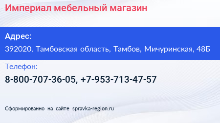 Империал, мебельный магазин по адресу 392020, Тамбовская область, Тамбов, Мичуринская, 48Б в дальнейшем Организация, размещена в следующих категориях: