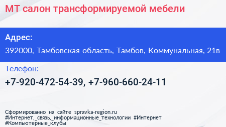 MT, салон трансформируемой мебели по адресу 392000, Тамбовская область, Тамбов, Коммунальная, 21в в дальнейшем Организация, размещена в следующих категориях: