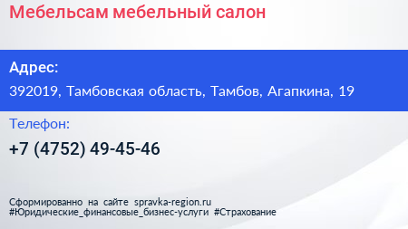 Мебельсам, мебельный салон по адресу 392019, Тамбовская область, Тамбов, Агапкина, 19 в дальнейшем Организация, размещена в следующих категориях:
