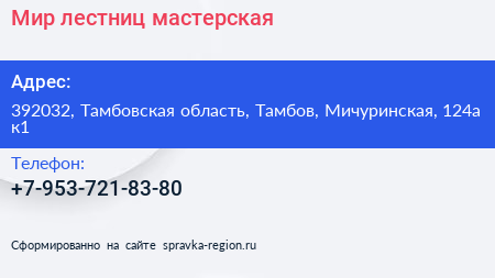 Мир лестниц, мастерская по адресу 392032, Тамбовская область, Тамбов, Мичуринская, 124а к1 в дальнейшем Организация, размещена в следующих категориях: