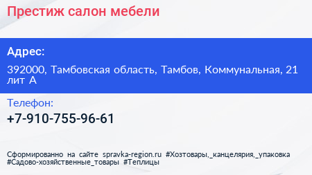 Престиж, салон мебели по адресу 392000, Тамбовская область, Тамбов, Коммунальная, 21 лит А в дальнейшем Организация, размещена в следующих категориях:
