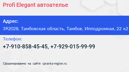 Profi Elegant, автоателье по адресу 392028, Тамбовская область, Тамбов, Ипподромная, 22 к2 в дальнейшем Организация, размещена в следующих категориях: