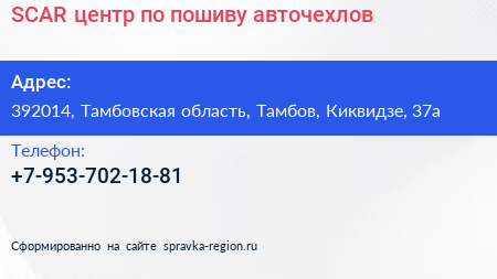 SCAR, центр по пошиву авточехлов по адресу 392014, Тамбовская область, Тамбов, Киквидзе, 37а в дальнейшем Организация, размещена в следующих категориях:
