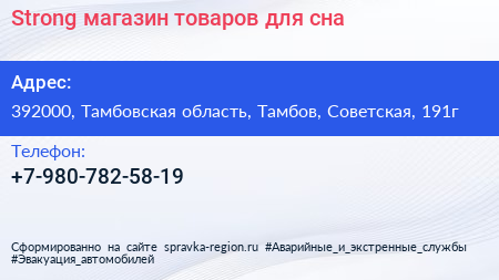 Strong, магазин товаров для сна по адресу 392000, Тамбовская область, Тамбов, Советская, 191г в дальнейшем Организация, размещена в следующих категориях: