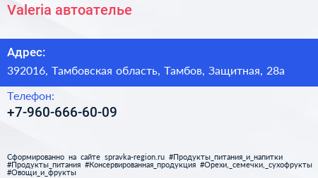 Valeria, автоателье по адресу 392016, Тамбовская область, Тамбов, Защитная, 28а в дальнейшем Организация, размещена в следующих категориях:
