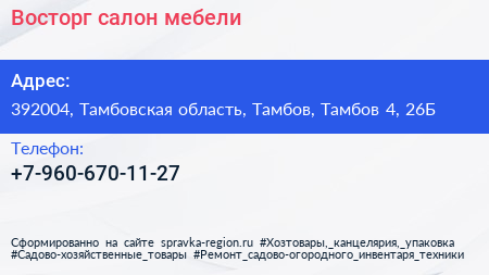 Восторг, салон мебели по адресу 392004, Тамбовская область, Тамбов, Тамбов 4, 26Б в дальнейшем Организация, размещена в следующих категориях: