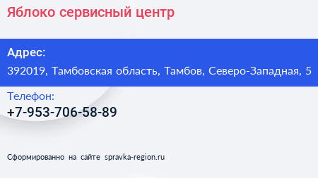 Яблоко, сервисный центр по адресу 392019, Тамбовская область, Тамбов, Северо-Западная, 5 в дальнейшем Организация, размещена в следующих категориях: