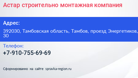 Астар, строительно-монтажная компания по адресу 392030, Тамбовская область, Тамбов, проезд Энергетиков, 30 в дальнейшем Организация, размещена в следующих категориях: